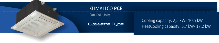 Klimallco Hydronic Cassette Fan Coils are the ideal solution for cooling/heating applications. They are available in eight models with nominal capacities ranging from 2,45 kW to 10,7 kW in cooling and 2,02 kW up to 22,96 kW in heating.
