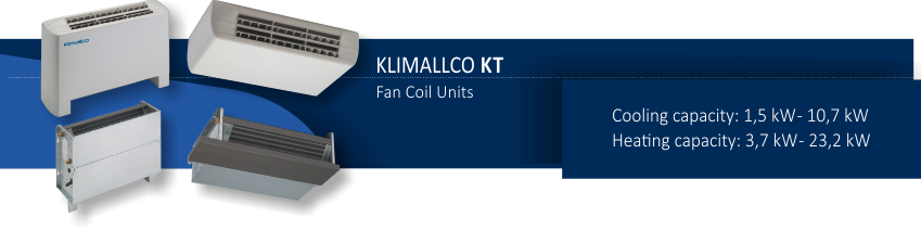 Klimallco Fan coil Units are the solution for cooling/heating applications. They are available in a wide range of models and sizes with nominal capacities ranging from 1.5 kW to 10.7 kW in cooling and 3.7 kW up to 23.2 kW in heating.