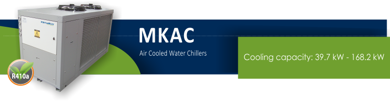 The Klimallco MKAC - MKAH medium capacity series are packaged air cooled water heat pumps for cooling and heating applications and outdoor installation. They are available in 3 series with 8 models with nominal capacities ranging from 39,7 to 168,2 kW.