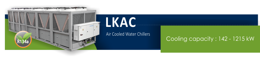 The Klimallco LKAC large series are packaged air cooled water chillers for cooling applications and outdoor installation. They are available in 14 models with nominal capacities ranging from 142 to 1.215 kW.