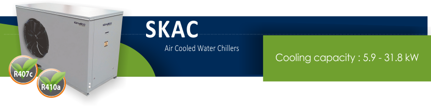 The Klimallco SKAC large series are packaged air cooled water chillers for cooling applications and outdoor installation. They are available in 9 models with nominal cooling capacities ranging from 5,8 to 31,8 kW.