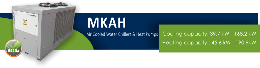 The Klimallco MKAC - MKAH medium capacity series are packaged air cooled water heat pumps for cooling and heating applications and outdoor installation. They are available in 3 series with 8 models with nominal capacities ranging from 39,7 to 168,2 kW for cooling and 45,6 to 190,9 kW in heating.