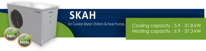The Klimallco SKAC / SKAH large series are packaged air cooled water chillers for cooling applications and outdoor installation. They are available in 9 models with nominal cooling capacities ranging from 5,8 to 31,8 kW and 6,9 to 37,3 kW.